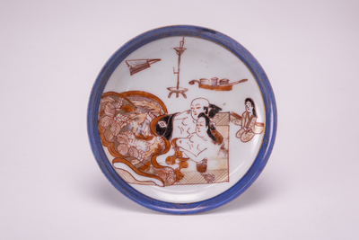 Schotel op voetring, spreidende wand. Imari, versierd in onderglazuur blauw, ijzerrood, zwart en goud met een naakt paar op een matras, half onder een deken. Aan het hoofdeinde een knielende dienares, een waaier, een kaarsenhouder en een bak met potjes en een penseel. Op de rand een rankpatroon in goud op een blauwe grond. Binnenin op de bodem van het kopje een parende haan en hen. Op de achterkant van de schotel een prunus, een chrysant en een camelia. (Nederlands)