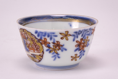 Imari kopje met op de buitenkant een vaas met takken en links en rechts een gouden cirkel.