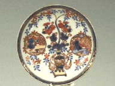 Imari schoteltje met op het plat een vaas met takken en links en rechts een gouden cirkel, Van Diepencollectie, JMD-P-2531