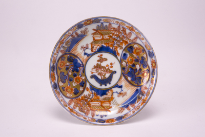 Imari schoteltje gedecoreerd in goud, blauw, ijzerrood en oranje.