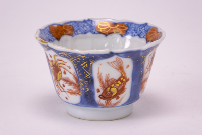 Kommetje zonder oor met gegolfde rand. Op de buitenzijde een blauw, ijzerrood en goud decor met zes uitsparingen met daarin zeedieren. Op de bodem twee personen staand op een vis. (Nederlands)