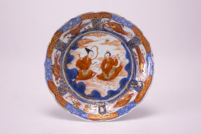 Schoteltje met gegolfde rand. Op de rand een blauw, ijzerrood en goud decor met zes uitsparingen met daarin zeedieren. Op de bodem twee personen staand op een vis. (Nederlands)