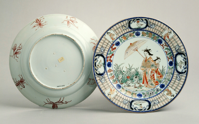 Bord op voetring, platte rand. Onder op de bodem vier proen-moeten. Imari, versierd in onderglazuur blauw, ijzerrood, goud, groen en zwart met twee vrouwen bij een rietkraag, de achterste houdt een parasol op, de voorste kijkt naar drie waadvogels. Rondom een smalle band met bloemtakjes en bloesems. Op de wand een drie rijen met honingraat motieven, onderbroken door vier vakken, elk met een andere vogel, en vier kleinere medaillons met de parasoldraagster. Op de achterkant van de wand zeven insecten in ijzerrood. (Nederlands)
