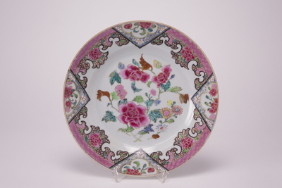 Famille rose bord met op het plat meerkleurige pioendecoraties.Op de drukbewerkte roze rand o.a. vier zwarte driehoeken of servetten met bloemen.