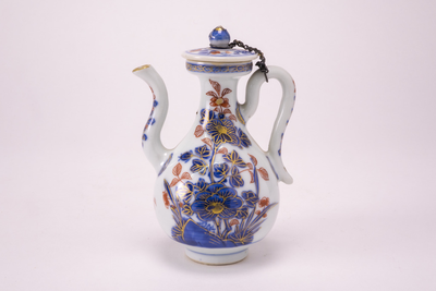 Balustervormig kannetje met slanke tuit en oor. Het platte dekseltje is met een kettinkje aan het oor bevestigd. Gedeocreerd met een takkendecor in blauw, ijzerrood en goud.