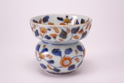Imari zandstrooier voor op een schrijftafel. Een bolvormig reservoir met daarop een cilindrische schotel met gaatjes in het plat. Gedecoreerd met bloemen en blaadjes.