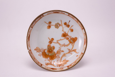 Capuceiner schoteltje met op het plat een decoratie in ijzerrood en goud met o.a. bloemen en een tak. (Nederlands)
