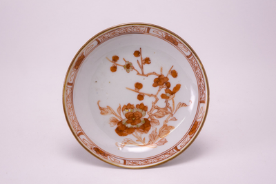 Capuceiner schoteltje met op het plat een decoratie in ijzerrood en goud met o.a. bloemen en een tak. (Nederlands)