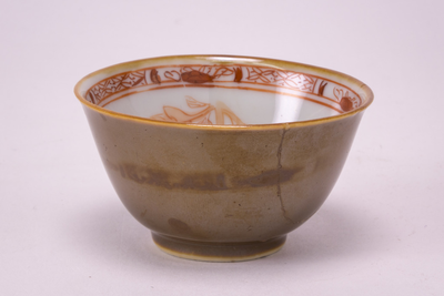 Capuceiner kommetje met aan de binnenzijde een decoratie in ijzerrood en goud met o.a. bloemen en een tak.