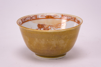 Capuceiner kommetje met aan de binnenzijde een decoratie in ijzerrood en goud met o.a. bloemen en een tak.