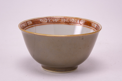 Capuceiner kommetje met aan de binnenzijde een decoratie in ijzerrood en goud met o.a. bloemen en een tak.
