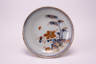 Capuceiner schoteltje met op het plat een decoratie in blauw, ijzerrood en goud met o.a. bloemen, bamboe en een hekje. (Nederlands)