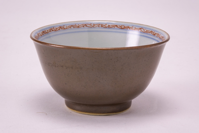 Capuceiner kommetje met aan de binnenzijde een decoratie in blauw, ijzerrood en goud met o.a. bloemen, bamboe en een hekje.