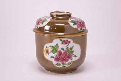 Capucijner kom met deksel. Op de kom en op het deksel in het bruin drie uitsparingen met hierin een bloemdecoratie.