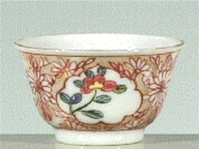 Miniatuur kommetje met op de buitenzijde een goudkleurig bloemdecor met daarin drie uitsparingen met hierin meerkleurige bloemetjes. Op de bodem een persoon met bloemenmand. (Nederlands)