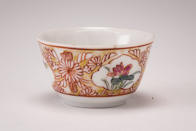 Miniatuur kommetje met op de buitenzijde een goudkleurig bloemdecor met daarin drie uitsparingen met hierin meerkleurige bloemetjes. Op de bodem een persoon met bloemenmand.