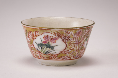 Miniatuur kommetje met op de buitenzijde een goudkleurig bloemdecor met daarin drie uitsparingen met hierin meerkleurige bloemetjes. Op de bodem een persoon met bloemenmand.