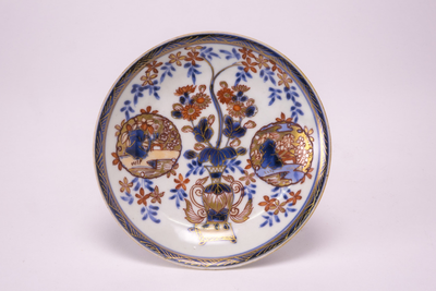 Miniatuur schoteltje met op de rand een goudkleurig bloemdecor met daarin drie uitsparingen met hierin meerkleurige bloemetjes. In het midden een persoon met bloemenmand.