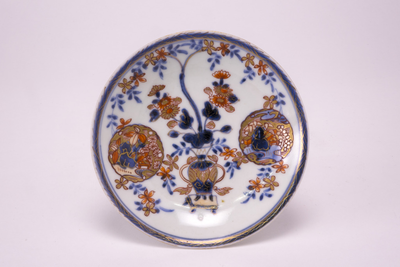Miniatuur schoteltje met op de rand een goudkleurig bloemdecor met daarin drie uitsparingen met hierin meerkleurige bloemetjes. In het midden een persoon met bloemenmand. (Nederlands)