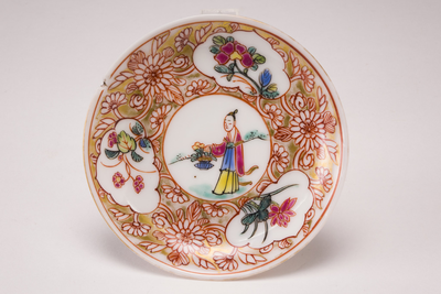 Miniatuur schoteltje met op de rand een goudkleurig bloemdecor met daarin drie uitsparingen met hierin meerkleurige bloemetjes. In het midden een persoon met bloemenmand. (Nederlands)