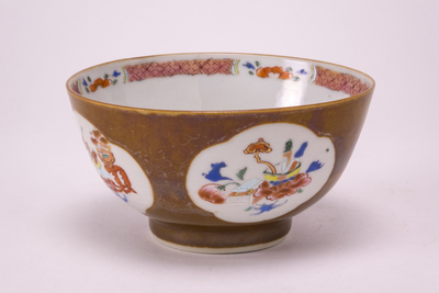 Capucijner kom met op de buitenzijde vier uitsparingen met daarin een bloemdecor. Op de binnenzijde een famille rose bloemdecor.