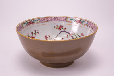 Capucijner kom met op de binnenzijde een famille rose decor met bloementak, vogel en pioenrozen.