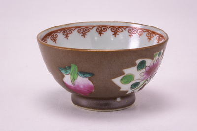 Capucijner kommetje met in het bruin vier uitsparingen met hierin een bloem- of vruchtdecoratie, Van Diepencollectie, JMD-P-2645 |