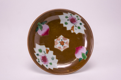 Capucijner schoteltje met in het bruin vijf uitsparingen met hierin een bloem- of vruchtdecoratie. (Nederlands)