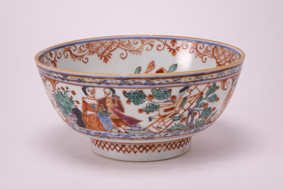 Amsterdams bont kom op standring. Op de bodem een hengselmand. Langs de binnenrand een ijzerrode guirlandeversiering aan een blauwe band. Op de buitenzijde o.a. een Europees paar en een appelplukker op een ladder. (Nederlands)