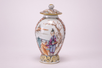 Dekselpotje met een knopdeksel. Op het potje en het deksel veelkleurige Mandarijn- landschapdecors met o.a. drie volwassenen en een kind.