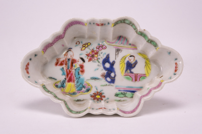 Ruitvormige witte patipan met geschulpte rand. Op het plat een famille rose decor met drie personen en een hoek van een huis. (Nederlands)