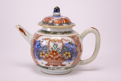Amsterdams bont theepotje met knopdeksel en op de buitenzijde witte uitsparingen met hierin een hengselmand of een landschapje.