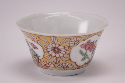 Famille rose kommetje met in vier uitsparingen meerkleurige decors. Hieromheen opgevuld met witte bloempjes op een goudkleurige ondergrond.