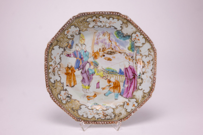 Achthoekig bord met op het plat veelkleurige Mandarijn- landschapdecors, Van Diepencollectie, JMD-P-2686