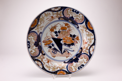 Diep Imari schotel met op het plat een gestyleerde vaas met bloemen. Op de rand een rankendecor met diverse cartouches gevuld met bloemen in ijzerrood, goud en blauw.