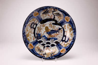 Rijk gedecoreerde Imari schotel met op het plat een decor met uit het water opspringende karpers, vissen en waterplanten. Op de rand een rankendecor vier cartouches gevuld met bloemen en vogels in ijzerrood, goud en blauw. Op de rand aan de achterzijde drie bloemtakken. (Nederlands)