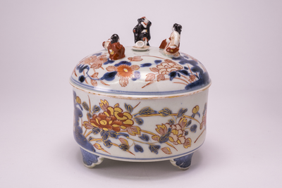 Cilindrische Imari boterpot op drie ruyi-vormige poten met rond deksel. Op het deksel in plastiek drie personen, een staande man, twee knielende vrouwen en vier voorwerpen mogelijk als scène uit een theeceremonie. Gedecoreerd met o.a. pioenrozen en chrysanten in blauw, ijzerrood en goud (Europese invloeden). (Nederlands)