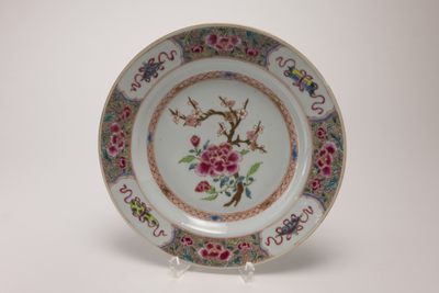 Famille rose bord met op plat een bloeiende prunus tak met een pioenrozen. Hier omheen een smalle ijzerrode band. Op de famille roze rand zijn vier uitsparingen aangebracht met daarin antiqiteiten. (Nederlands)