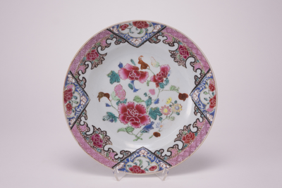 Famille rose bord met op het plat meerkleurige pioendecoraties.Op de drukbewerkte roze rand o.a. vier zwarte driehoeken of servetten met bloemen.