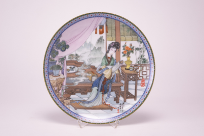 Veelkleurig bord met op het plat een huisinterieur met een persoon, een lezende chinese vrouw (Ying-Chun), zittend op een houten bank, Van Diepencollectie, JMD-P-2771 |