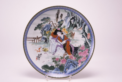 Veelkleurig bord met op het plat een tuin met een persoon, een liggende chinese vrouw (Hsiang-Yun) op een stenen bank. "Hsiang-Yun"