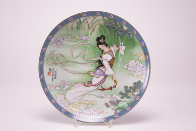 Veelkleurig bord met op het plat een tuin met een persoon, een staande chinese vrouw. "Witte Vrouwe"