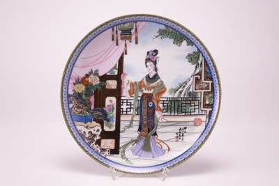 Veelkleurig bord met op het plat een bordes met in de deuropening een persoon, een staande chinese vrouw. "Hsi-feng"