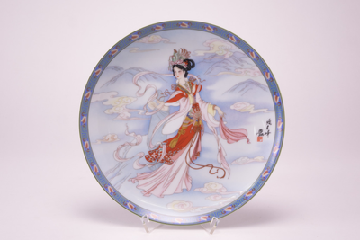 Veelkleurig bord met op het plat een berglandschap met een persoon, een staande chinese vrouw. "De vliegende bergtop"