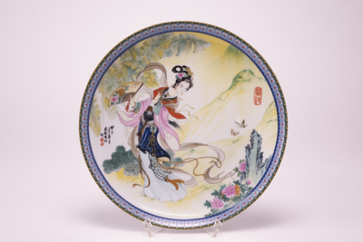 Veelkleurig bord met op het plat een berglandschap met een persoon, een staande chinese vrouw. "Pao-chai"