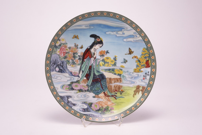 Veelkleurig bord met op het plat een persoon, een zittende chinese vrouw tussen chrysanten. Om haar vliegen vlinders. "De Chrysantengodin" (Nederlands)