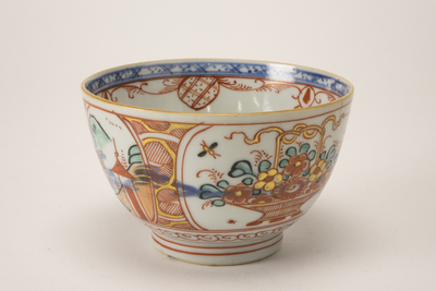 Amsterdams bont kom op standring. Op de bodem een hengselmand. Langs de binnenrand een ijzerrode guirlandeversiering aan een blauwe band. Aan de buitenzijde vier uitsparingen met hierin een hengselmand en in de twee anderen een landschapje. (Nederlands)