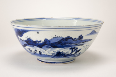 Kastkom met rondlopend blauw landschapdécor. (Nederlands)