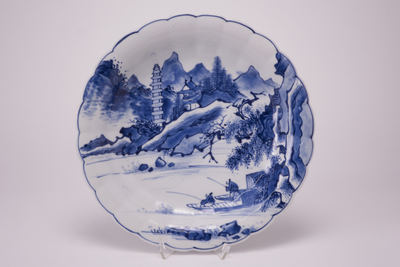 Bord op voetring, geschulpte rand. Versierd in onderglazuur blauw met een berglandschap met een rivier en bomen, twee vissersbootjes op het water, een pagode en een huis op de oever. Op de rand een blauwe lijn als kader. Op de achterkant vier maal gestileerde bamboebladeren. Onder op de bodem een merk in een dubbele cirkel. (Nederlands)