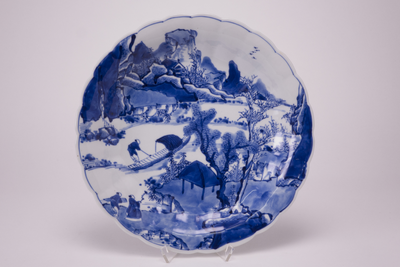 Bord op voetring, geschulpte rand. Versierd in onderglazuur blauw met een berglandschap met een rivier en bomen, een bootje met een persoon op het water, een afdak met twee personen op de oever en een huis in de bergen. Vogels in de lucht. Op de rand een blauwe lijn als kader. Op de achterkant vier maal gestileerde bamboebladeren. Onder op de bodem een merk in een dubbele cirkel. (Nederlands)